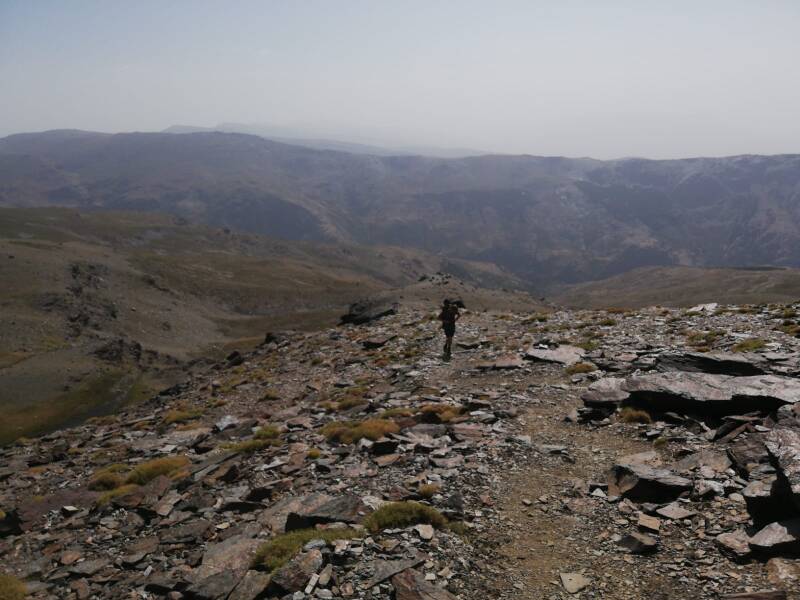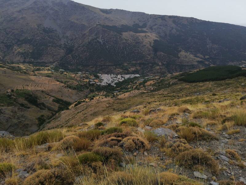 Jetzt folgt noch der unvermeidliche Abstieg. 2000m rauf heißt halt auch, 2000m wieder runter. Zehenschonend geht das kaum. Erst geht es eine ganze Weile relativ flach abfallend dahin, aber die letzten 1200m gehen steil runter. Wenigstens ist das Ziel bereits in Sicht. Trevelez bei noch 1200 Höhenmetern.