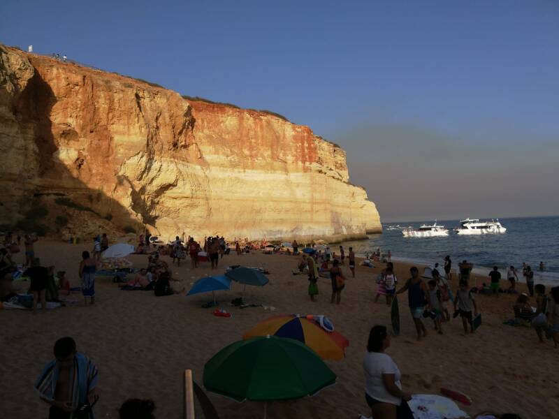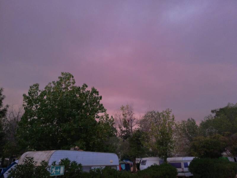 Bevor wir am Campingplatz ankamen, war der Himmel im Norden seltsam rötlich grau. Wir dachten an Saharastaub oder ein Gewitter. Als wir jetzt vom Strand zurückkamen, war unser Tisch leicht mit Ascheflöckchen gesprenkelt. Es gab oder gibt einen Waldbrand in ca. 50km Entfernung. Die Rauch- und Aschewolke hat uns mittlerweile voll erreicht.