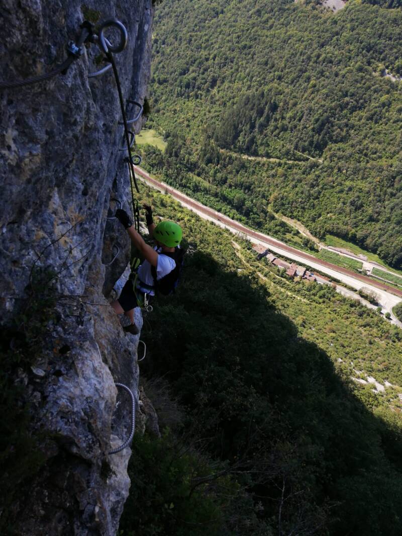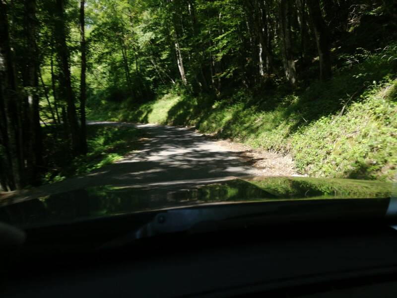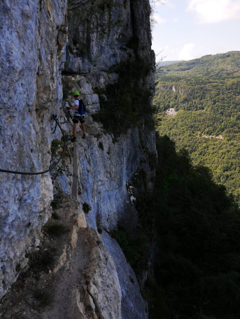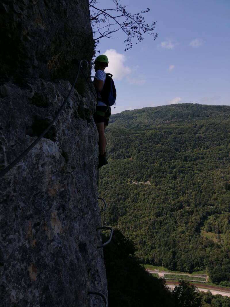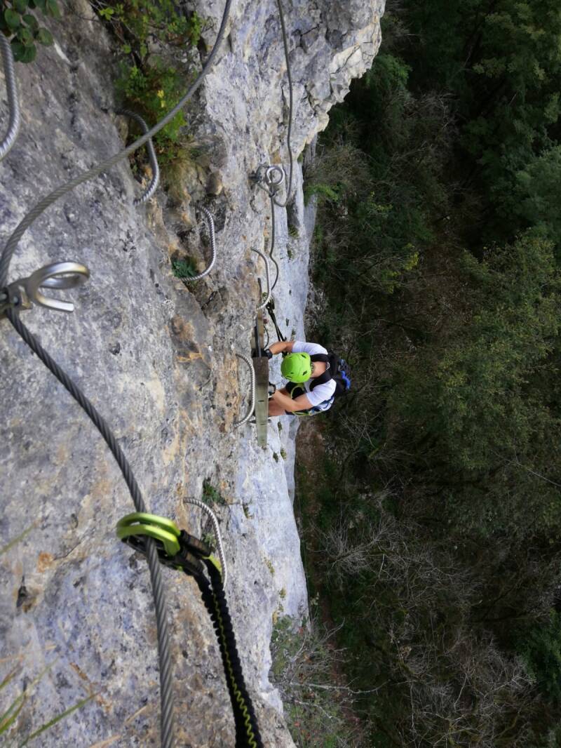 Nach dem Frühstück machten wir uns auf den Weg weiter Richtung Osten und damit Heimat. Aber ein paar „Abenteuer“ stehen noch an. Heute z.B. ein Klettersteig (https://www.bergsteigen.com/touren/klettersteig/via-ferrata-de-la-guinguette/) bei einem unbekannten Bergdörfchen namens Hostiaz. Wir erreichten es gegen Mittag. Allein die Anfahrt war schon ein Abenteuer. Eine enge Serpentinenstraße führte dorthin. Um jede Biegung und Kurve musste man im Schritttempo fahren, ein Ausweichen war kaum möglich.