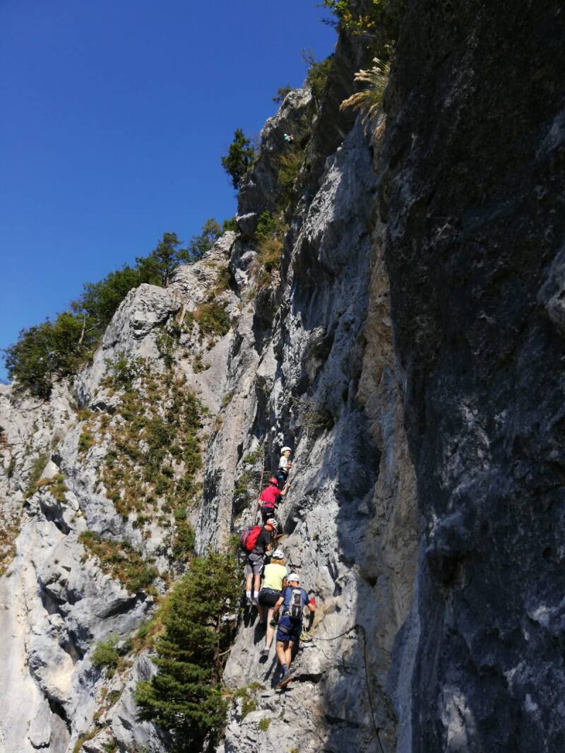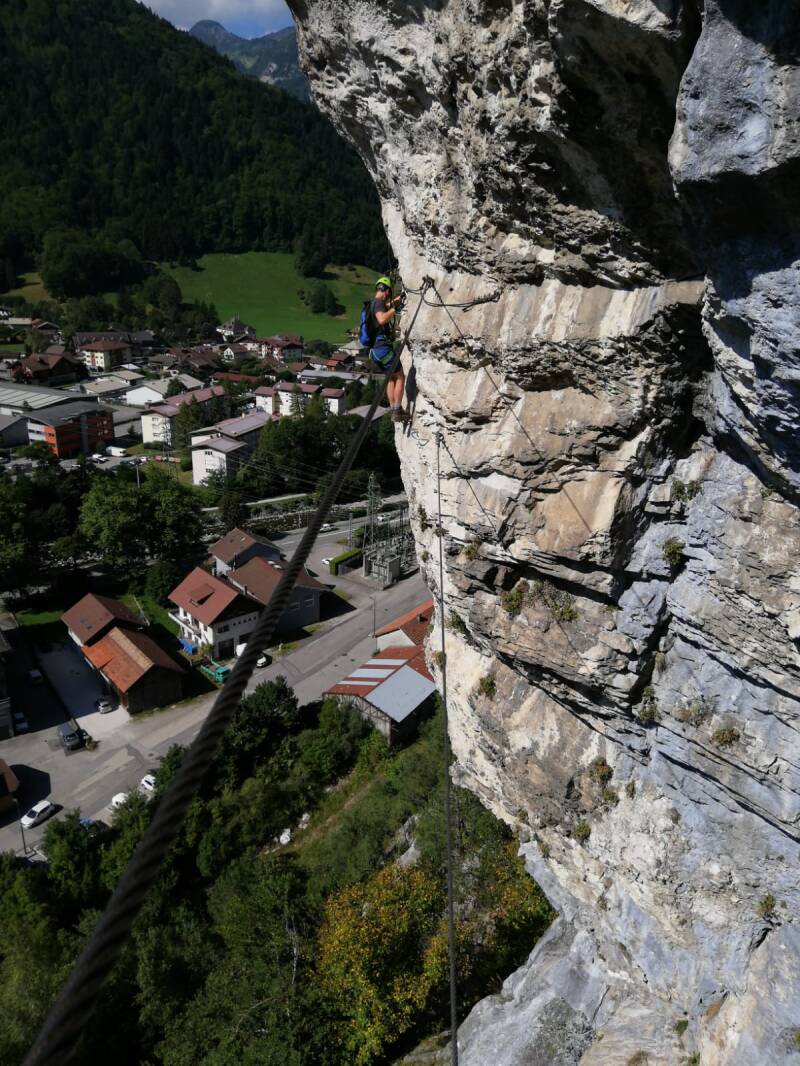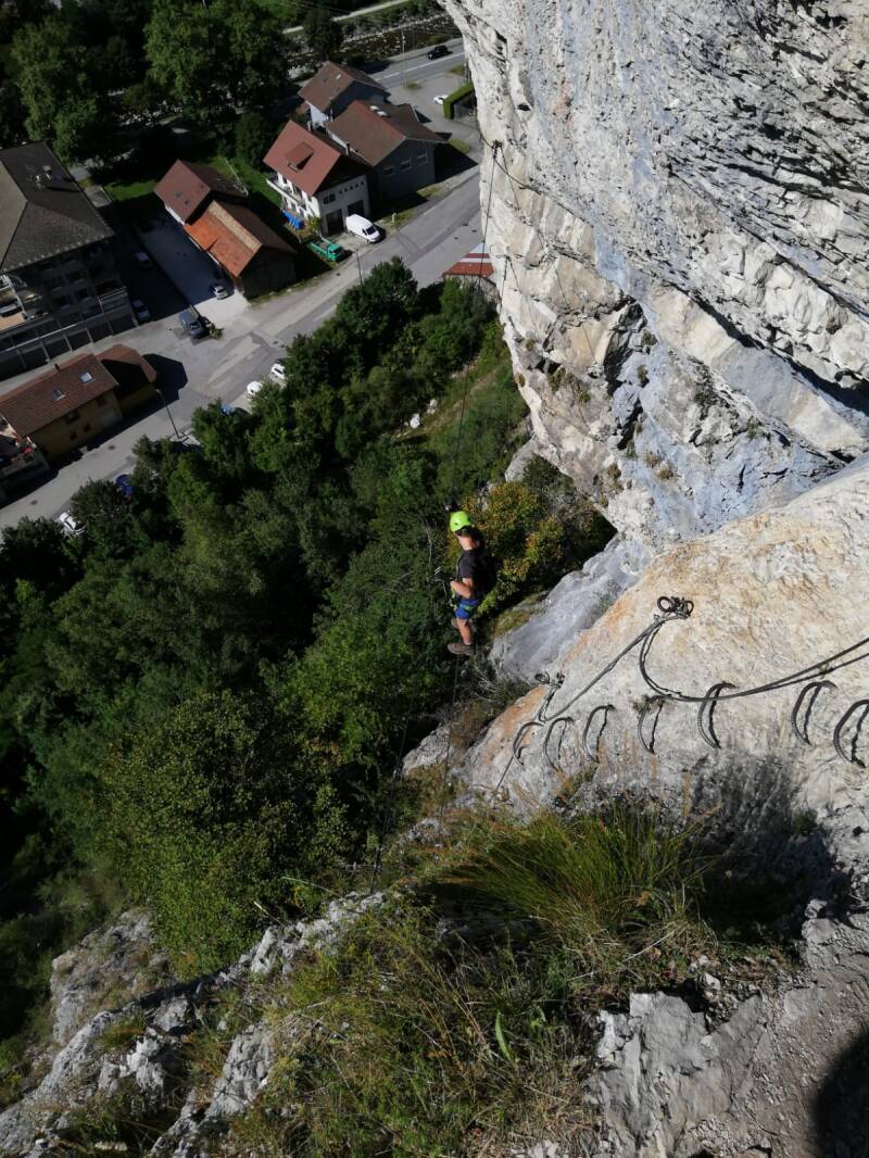 Dann ging’s auch schon wieder los, unser nächstes Ziel war nur 30 Minuten entfernt. Und was war’s? … Richtig, ein Klettersteig. https://www.bergsteigen.com/touren/klettersteig/via-ferrata-de-thones-la-roche-a-lagathe-le-surplomb-dermite/ Diesmal aber nicht in der Wildnis, wie der gestrige, sondern wir parkten mitten im Ort Thones und nach ein paar Gehminuten war der Einstieg erreicht.