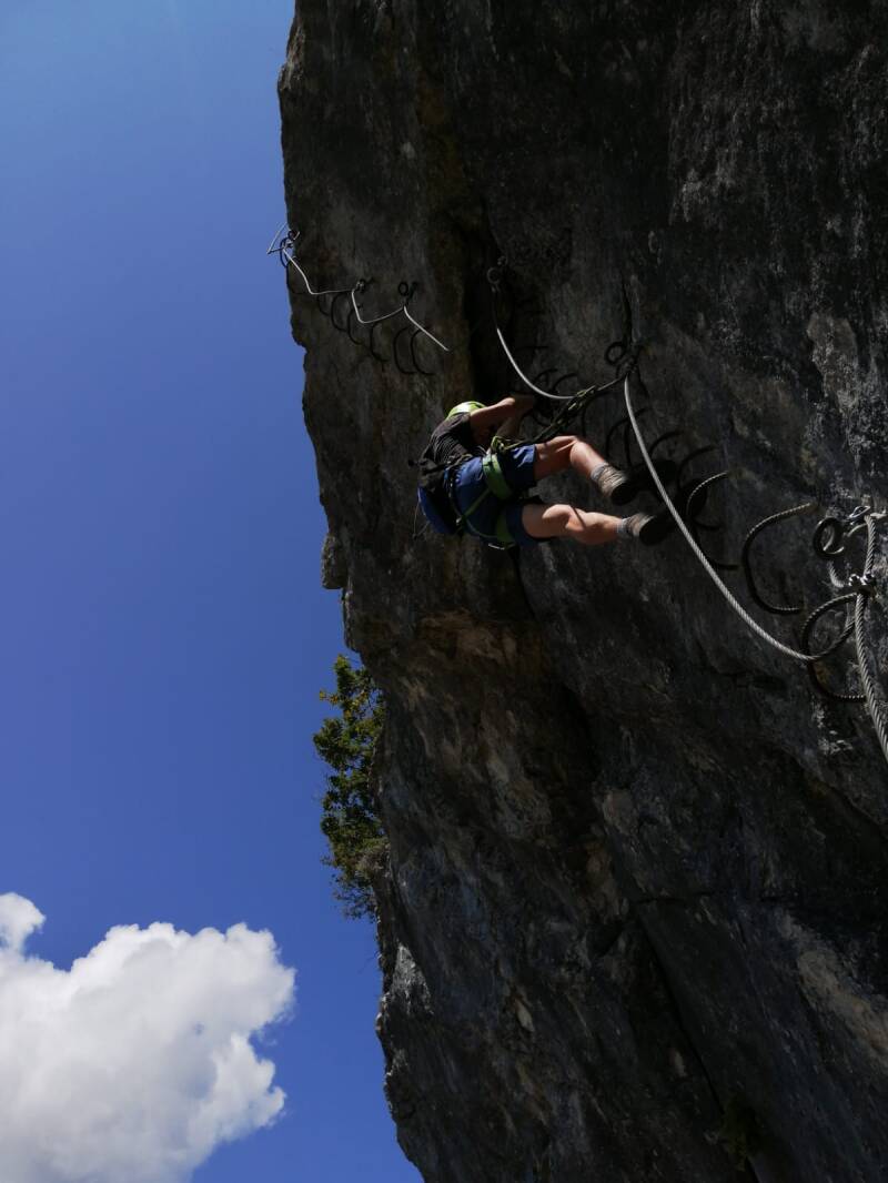 Der Steig führte ca. 15m überhängend aufwärts, oben war noch eine Kante, über die man es schaffen musste. Was das Ganze noch erschwerte, auf diesen 15m muss man 5 mal die Karabiner umhängen. Das heißt, eine Hand braucht man zum Umhängen, mit der anderen hält man sich fest. Das geht richtig in die Unterarme. Nicht umsonst ist diese Stelle mit dem Schwierigkeitsgrad E/F bewertet. Wir hatten bei anderen Steigen schon einige D- und E-Stellen, aber das war unsere erste E/F. Macht Lust auf mehr. Ich glaub, zuhause krame ich mal meine Unterarmtrainer raus.